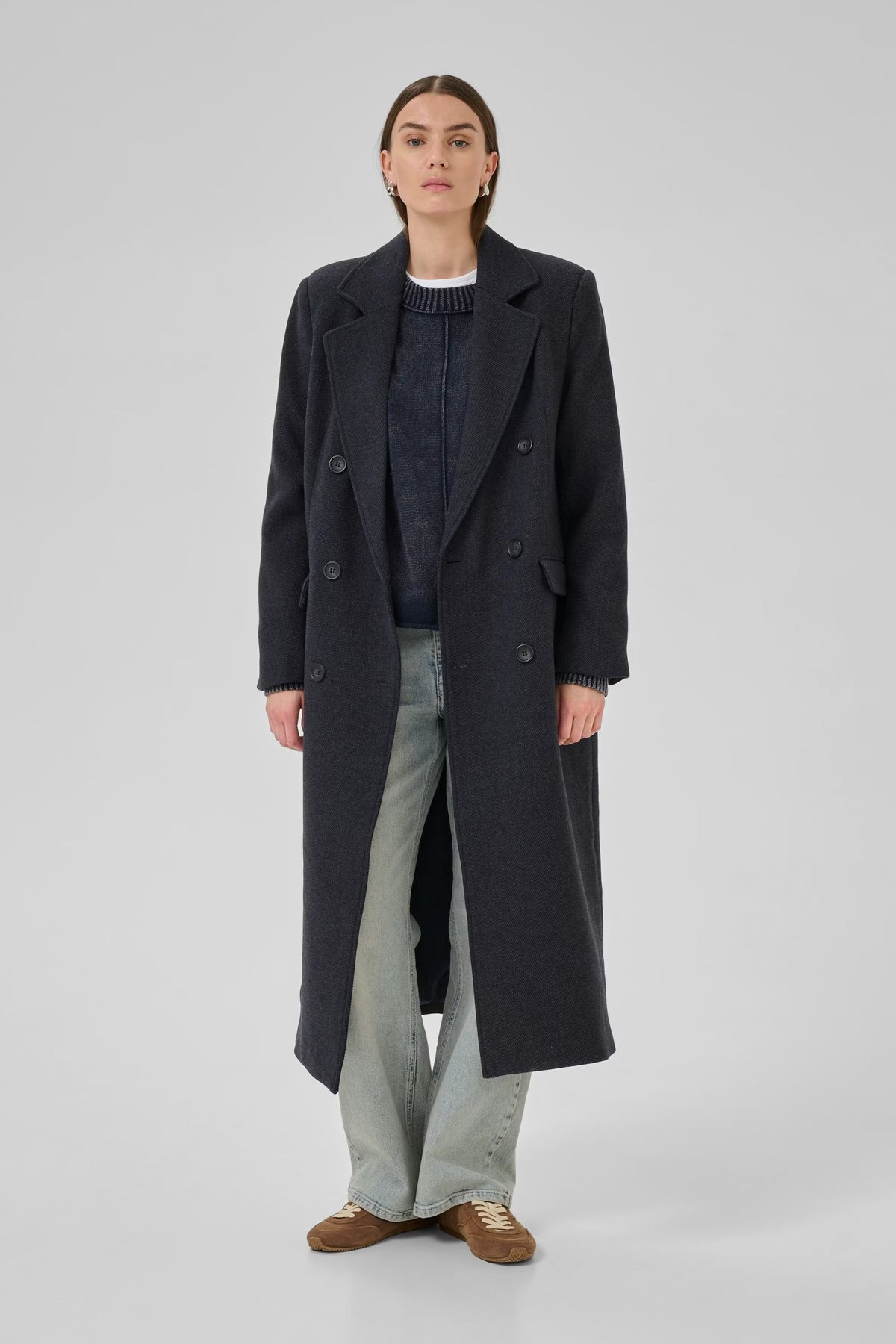 En klassisk lang damefrakke med dobbeltknaplukning, reverskrave og lige silhuet. Komfortabel pasform egnet til lag-på-lag...